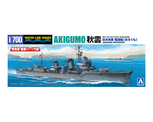 The 19th Kagero-class destroyer "Akigumo", which was long classified as a Yugumo-class destroyer, is now available as a 1/700 scale plastic model kit. With a parts configuration that focuses on the essential points, it is simple, easy to assemble, and can be accurately reproduced. Various equipment such as main guns and torpedo tubes have been newly designed and added. It effectively expresses the precision of the 1/700 scale.
