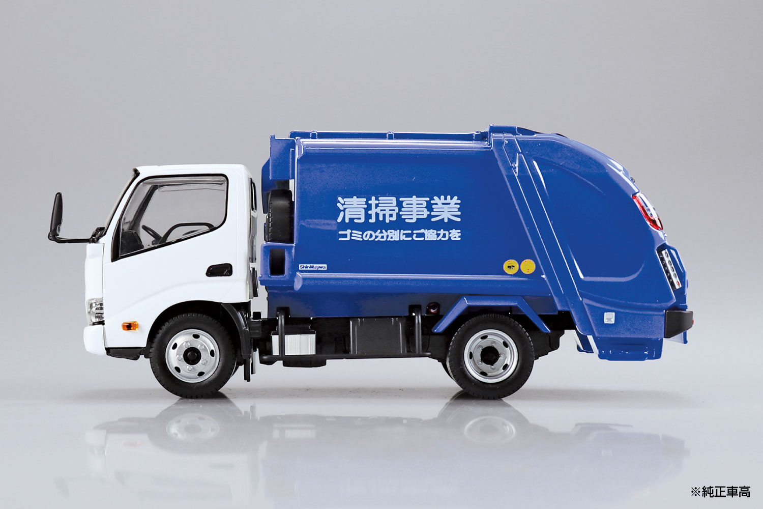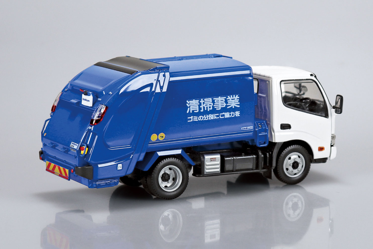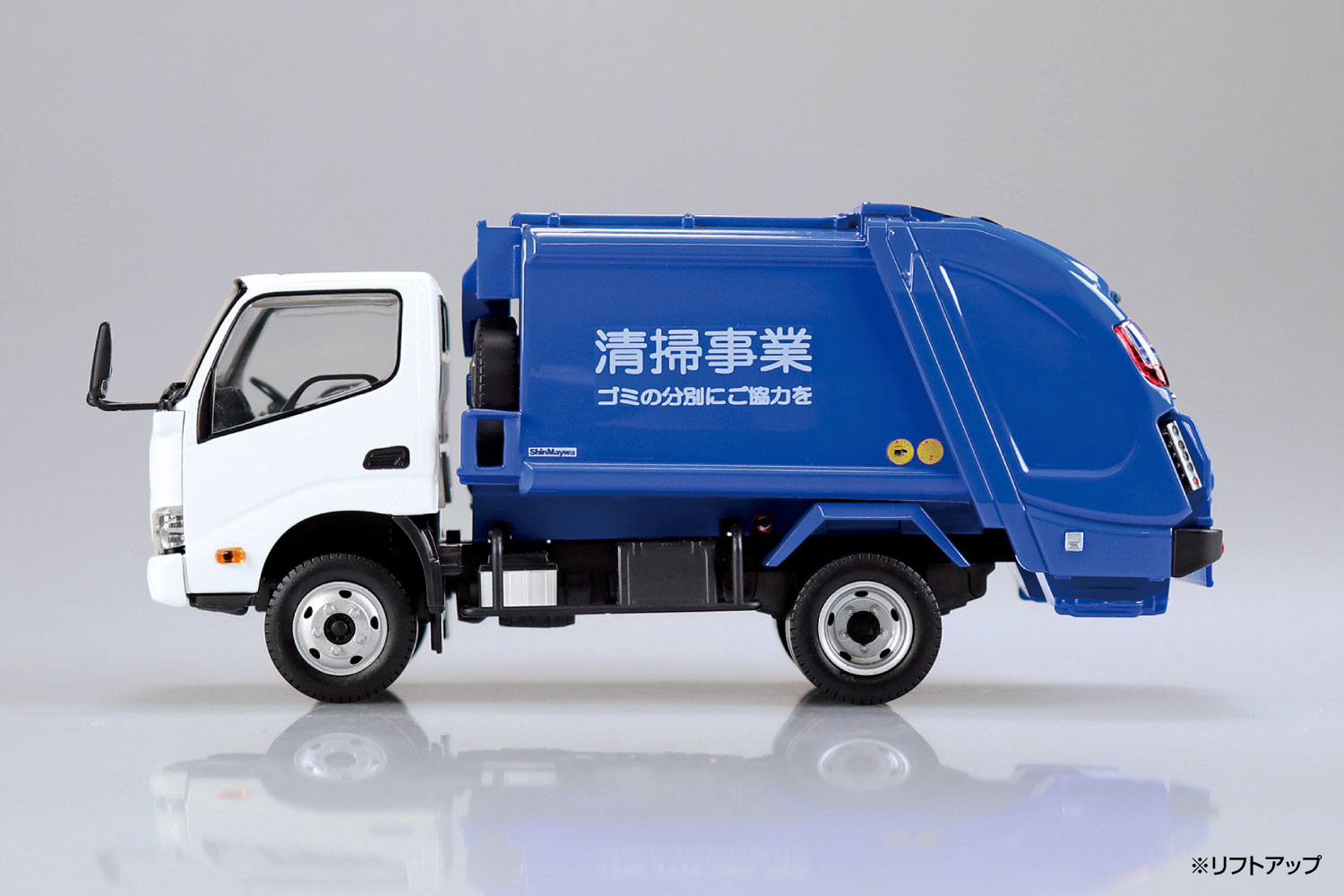 楽プラの「はたらく車」にパッカー車(ゴミ収集車)が登場します。キャブは日野・デュトロ、パッカー部は新明和工業製G-PXを立体化。ボディ下部フレームの装備もリアルに再現しました。パーツ数を抑え、塗装不要・接着剤不要。お子様からお年寄りまで楽しめるプラモデルです。
