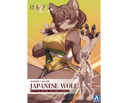 『けもプラ』は、自分好みのケモノを作れるカスタマイズプラモデルです。ケモノ要素・ヒト要素の割合を示すケモ度や、ケモノの種類などが、パーツ組み換えによって自由に調整できます。人とは違ったケモノならではのこだわりシルエットと、自分の理想を再現できる多種多様な組み合わせ方で、あなただけのオリジナルの世界観をお楽しみいただけます。ニホンオオカミはその名の通り、かつて日本に広く生息していたオオカミです。体色は主に褐色で、イヌに近い姿とされています。ボディはブラウンとライトブラウンの二色で成型され、溌剌とした丸めの瞳と、ふんわりとしたウルフカットとなっています。