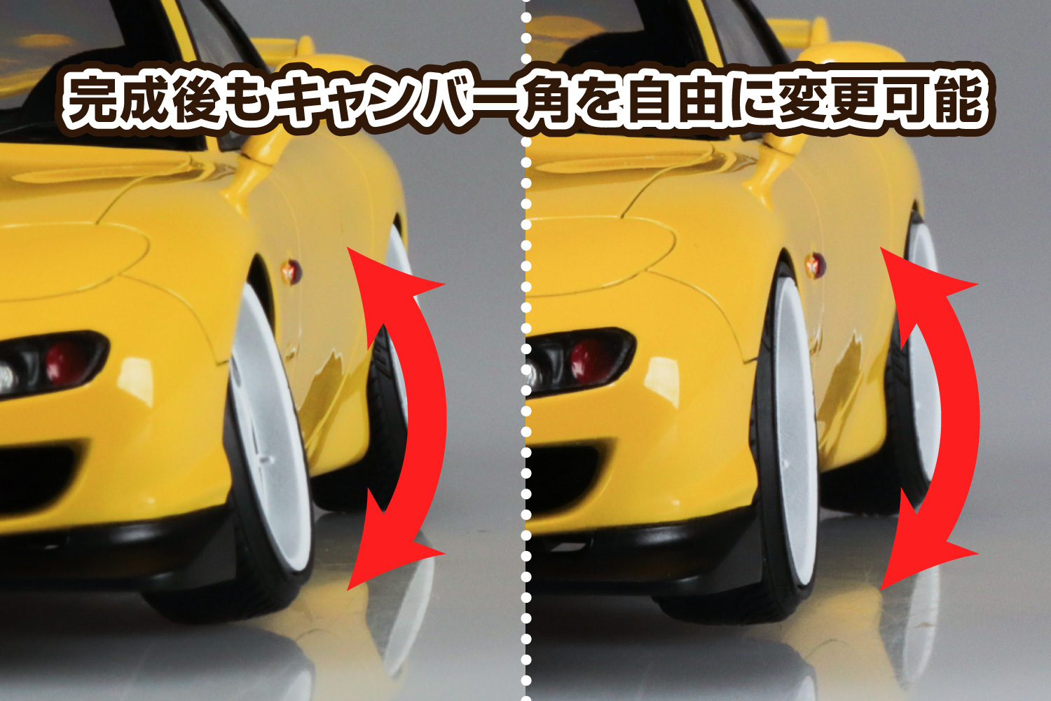 人気スポーツカーに新機構のシャーシを組み合わせ、完成後も車高とキャンバー角、ステアリング角が変更できるエアサスカスタムシリーズが新登場! ステアリングは左右が連動、車高とキャンバーは4輪それぞれ自由に調整できます。