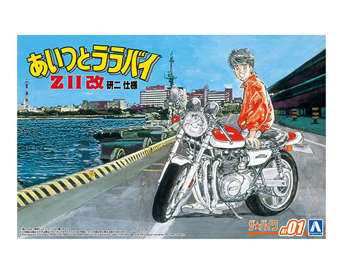 アオシマ 1/12 あいつとララバイNo.AI-01 「1/12 ZⅡ改 研二仕様」です。バイク漫画の先駆け的名作『あいつとララバイ』は、カワサキの名車、ZⅡの名を世に知らしめた漫画でもあります。キットは主人公 菱木研二の愛車Kawasaki750RS、通称ZⅡをカスタムパーツで忠実に再現しています。