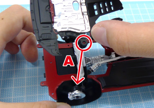 ボディとシャーシの接続です。このとき、シャーシ前後のつめがしっかりとボディの穴に嵌るよう注意しましょう。