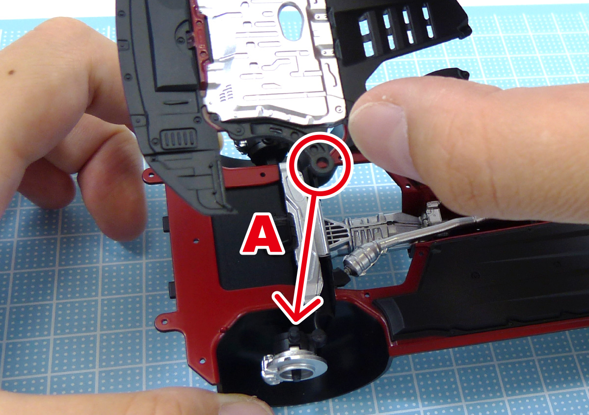 ボディとシャーシの接続です。このとき、シャーシ前後のつめがしっかりとボディの穴に嵌るよう注意しましょう。